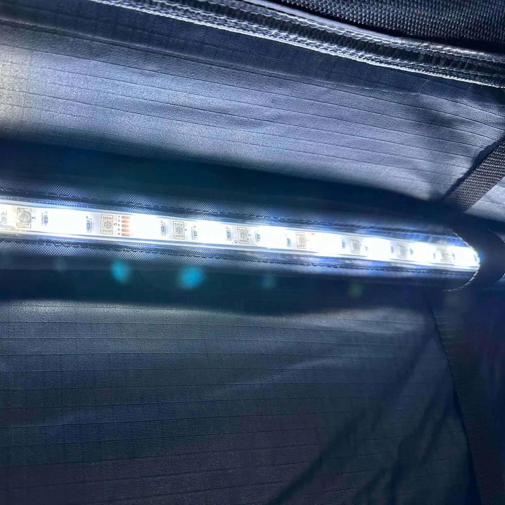 Ambiente im Dachzelt: Die LED-Leuchten sind im Innenraum des Dachzelts integriert und können bequem per dimmbarem Schalter bedient und zwischen drei unterschiedlichen Farbtönen hinundher geschaltet werden.