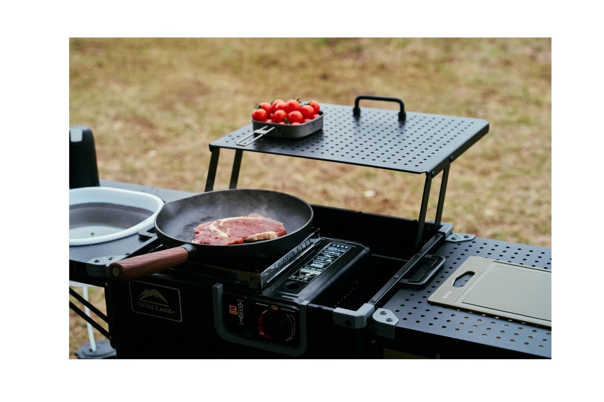 Die Wild Land Compact Integrated Stove & Kitchen ist die ideale Lösung für Camper, die Komfort und Platz beim Outdoor-Kochen schätzen. Diese kompakte Aluminium-Küche vereint Herd, Schneidebrett, Spüle, ausziehbare Schubladen und einen klappbaren Regalboden in einem praktischen, zusammenklappbaren Design. Mit klappbaren Beinen, einer Wasserpumpe, einem Gaskocher und Waschbecken-Zubehör bietet sie alles, was Sie für ein vollwertiges Outdoor-Kocherlebnis benötigen. Dank ihrer kompakten Größe passt sie in jeden Kofferraum und nimmt dabei kaum Platz weg. Der abnehmbare Gasherd ist leicht zu reinigen, und das gesamte Set wiegt nur 18 kg – perfekt für unterwegs.