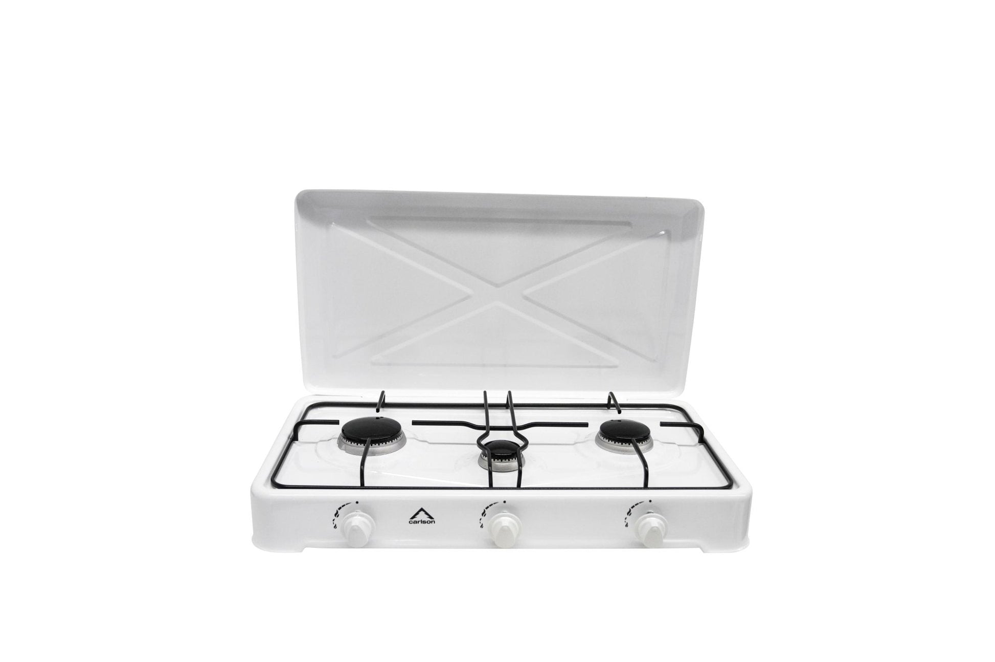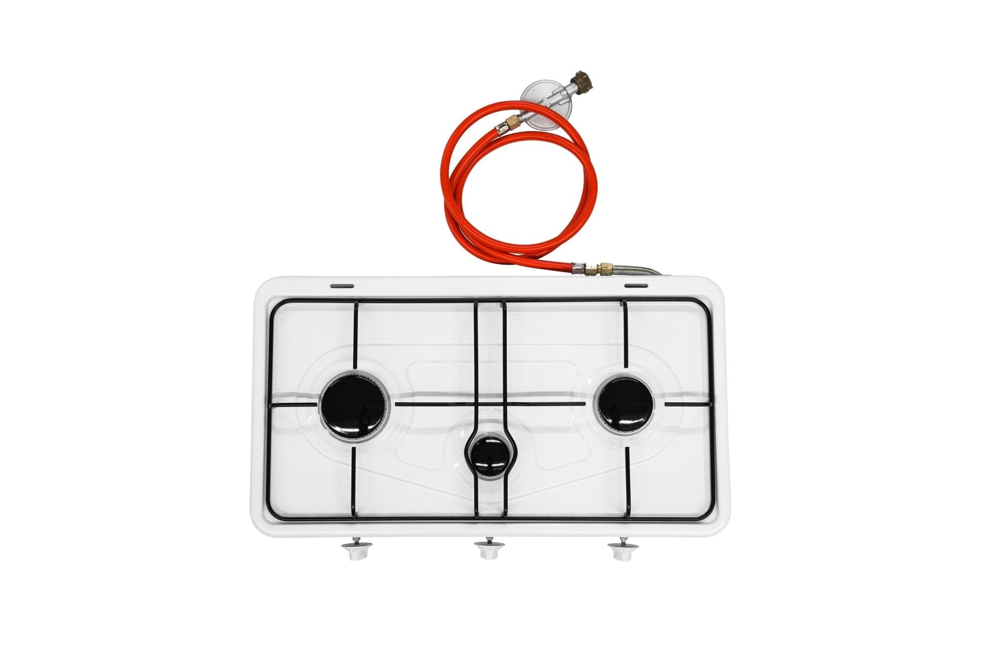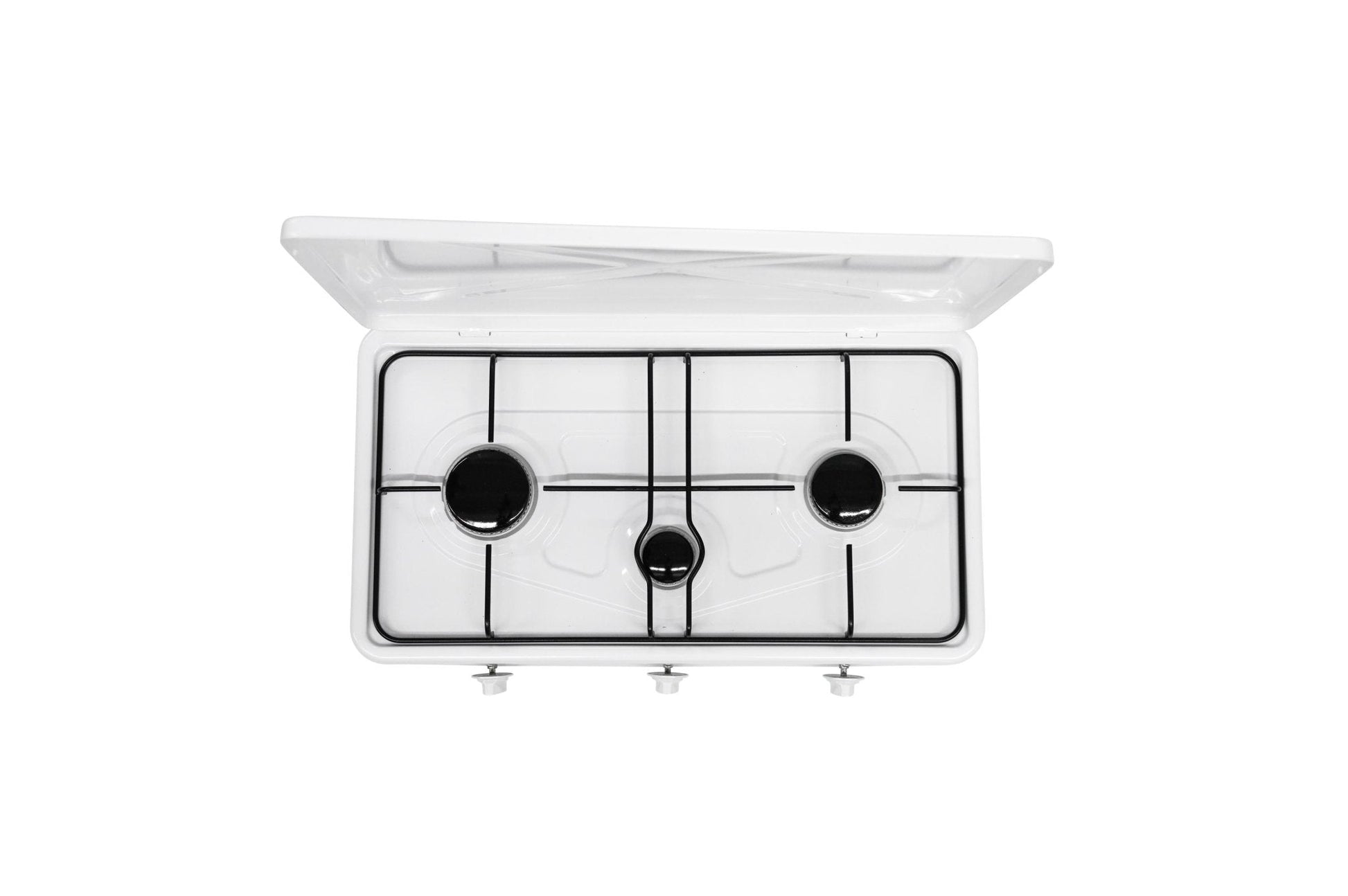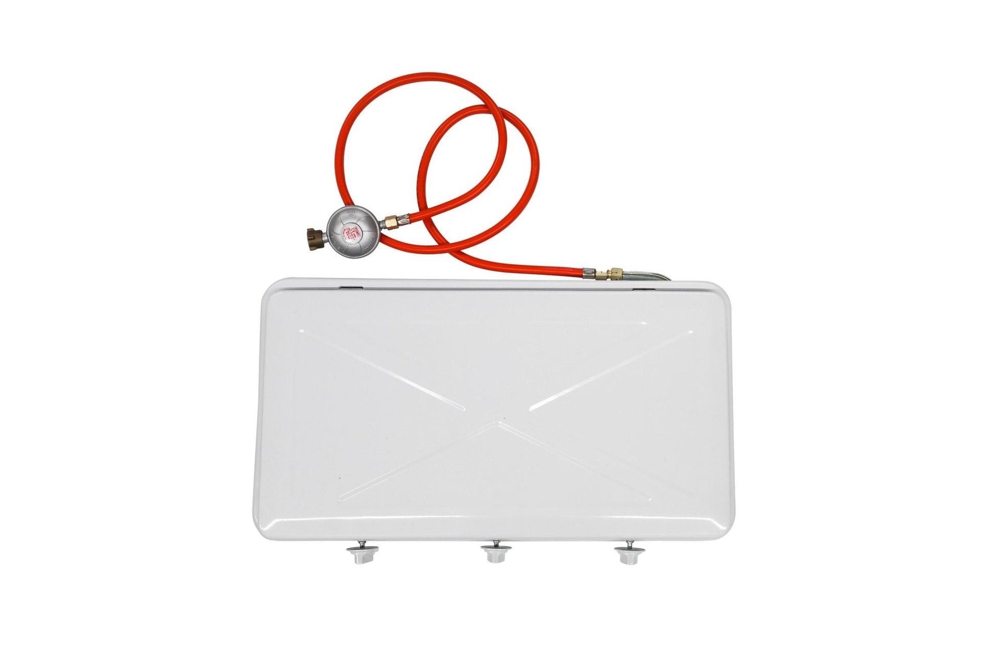 Kompakter Dreiflammen Gaskocher aus pulverisiertem Aluminium Gehäuse. Stufenlos verstellbare Flammenregler. Der Topfrost kann entfernt werden für die Reinigung des Gaskochers. Der aufklappbare Deckel dient zugleich als Windschutz beim kochen, dadurch kann der Gasverbrauch deutlich reduziert werden. Der Gaskocher kommt mit 1 1/4 Zoll Anschluss inklusive Gasschlauch und 29 m/Bar Druckregler.