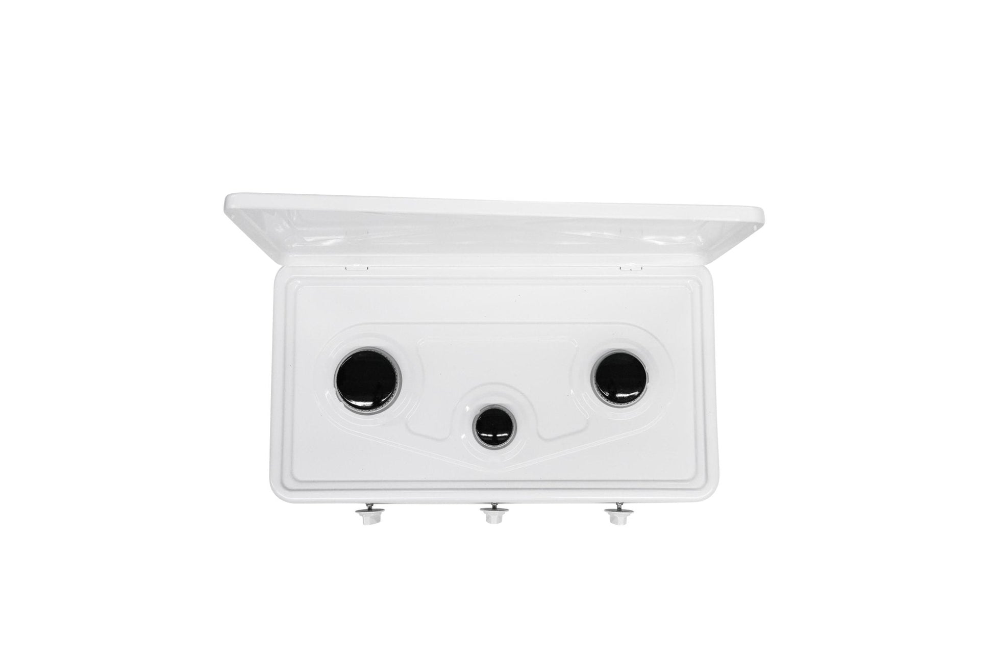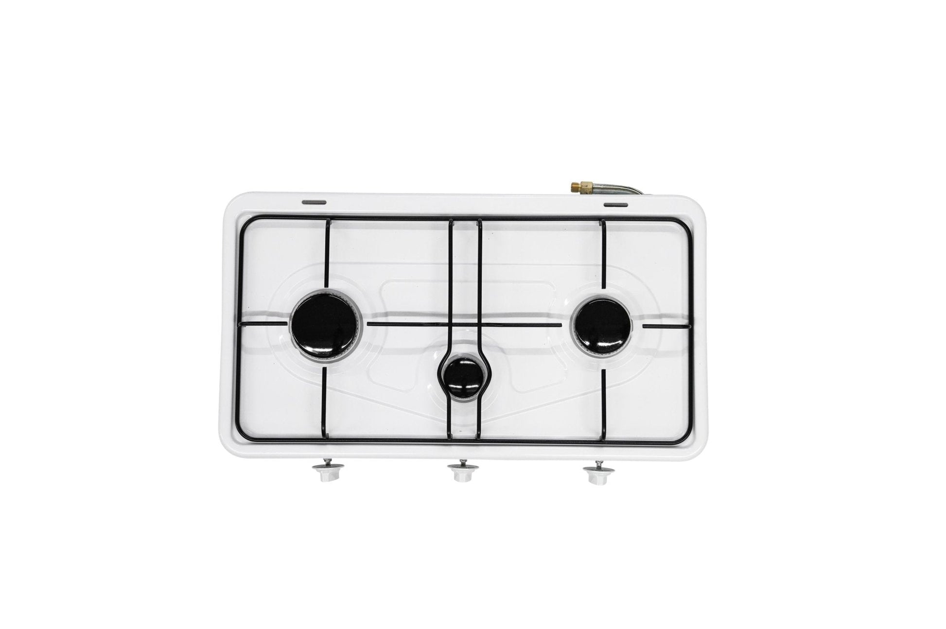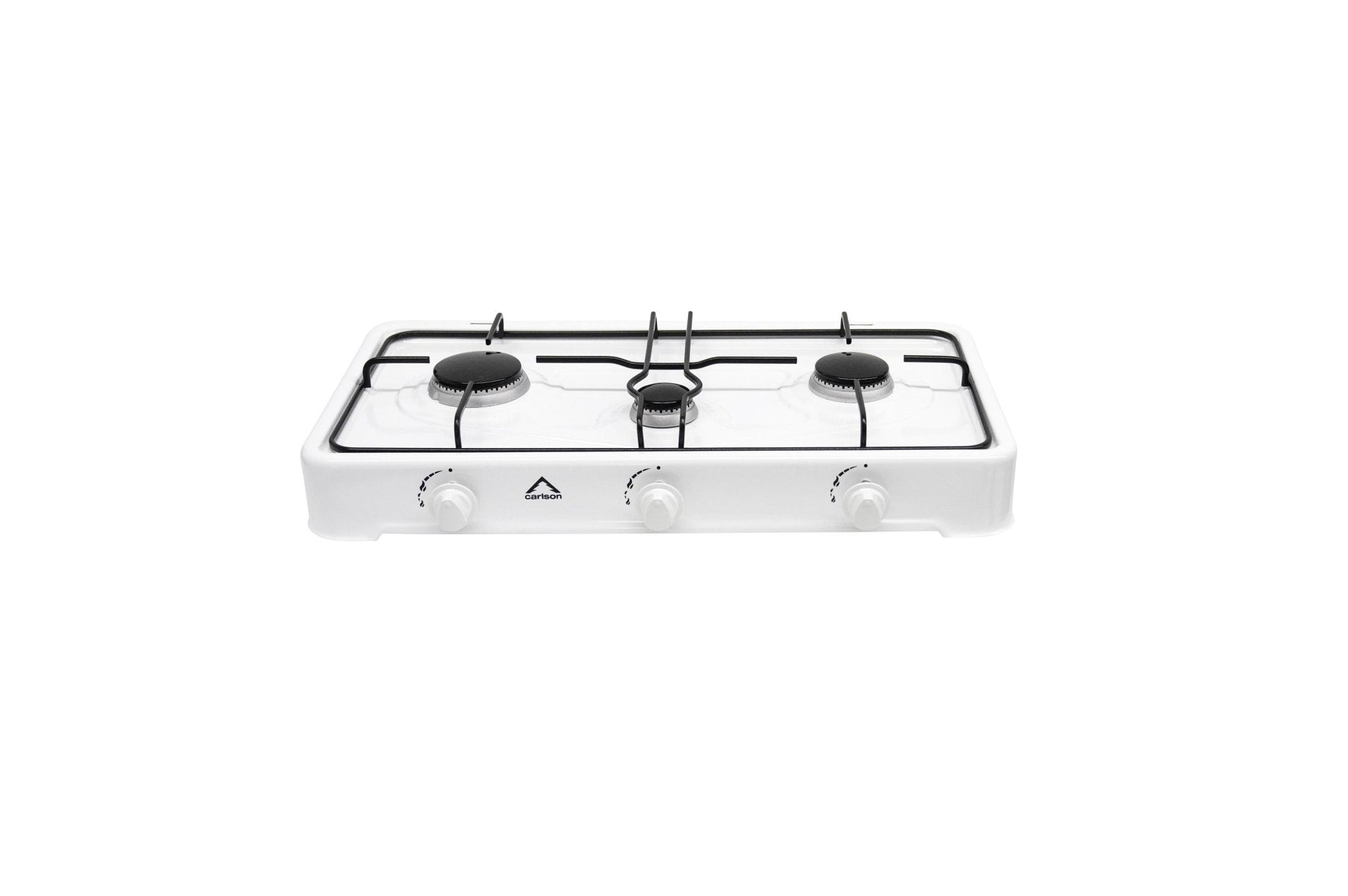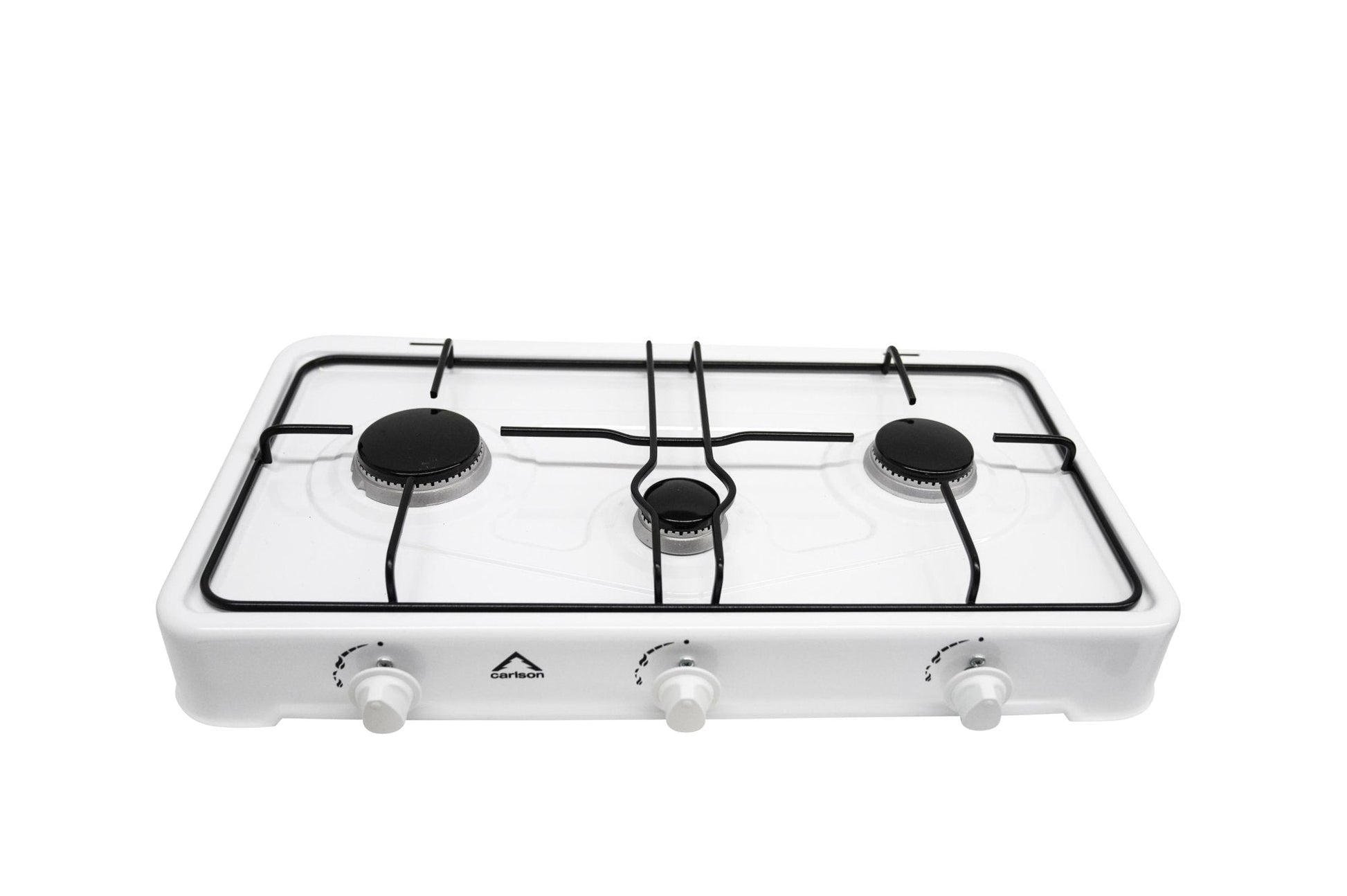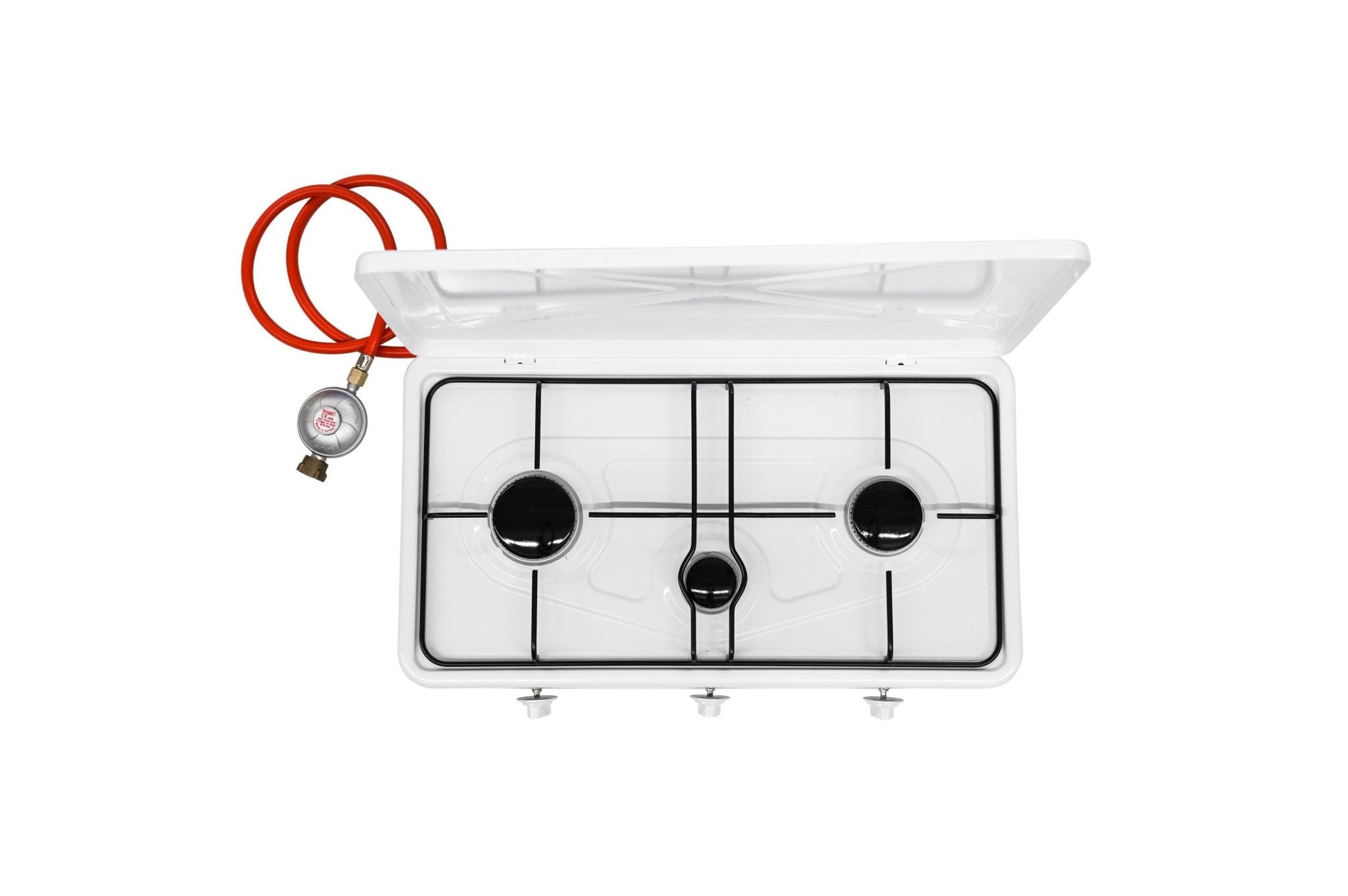 Kompakter Dreiflammen Gaskocher aus pulverisiertem Aluminium Gehäuse. Stufenlos verstellbare Flammenregler. Der Topfrost kann entfernt werden für die Reinigung des Gaskochers. Der aufklappbare Deckel dient zugleich als Windschutz beim kochen, dadurch kann der Gasverbrauch deutlich reduziert werden. Der Gaskocher kommt mit 1 1/4 Zoll Anschluss inklusive Gasschlauch und 29 m/Bar Druckregler.
