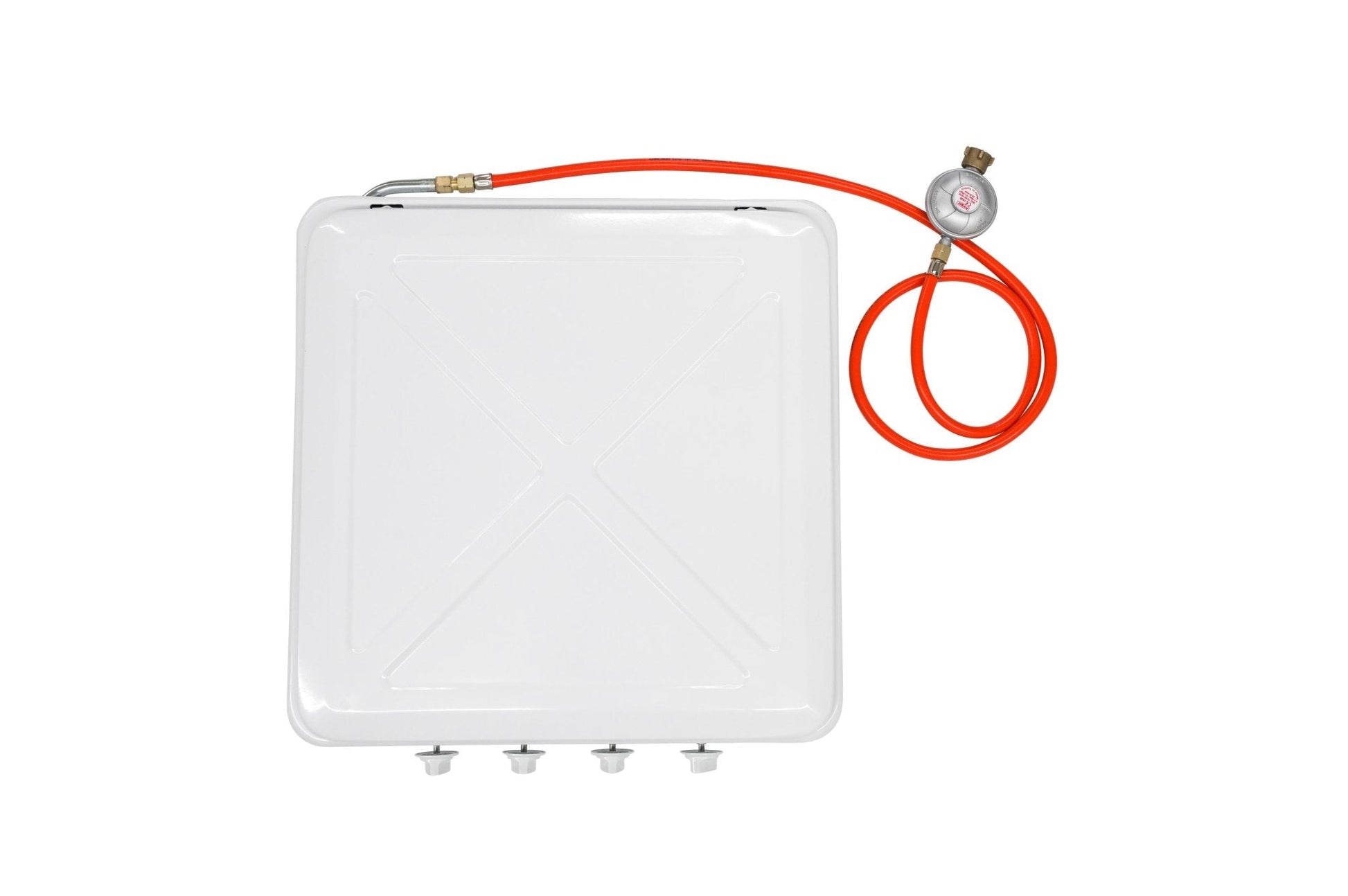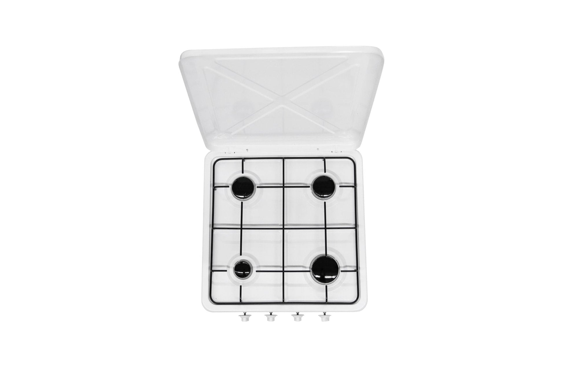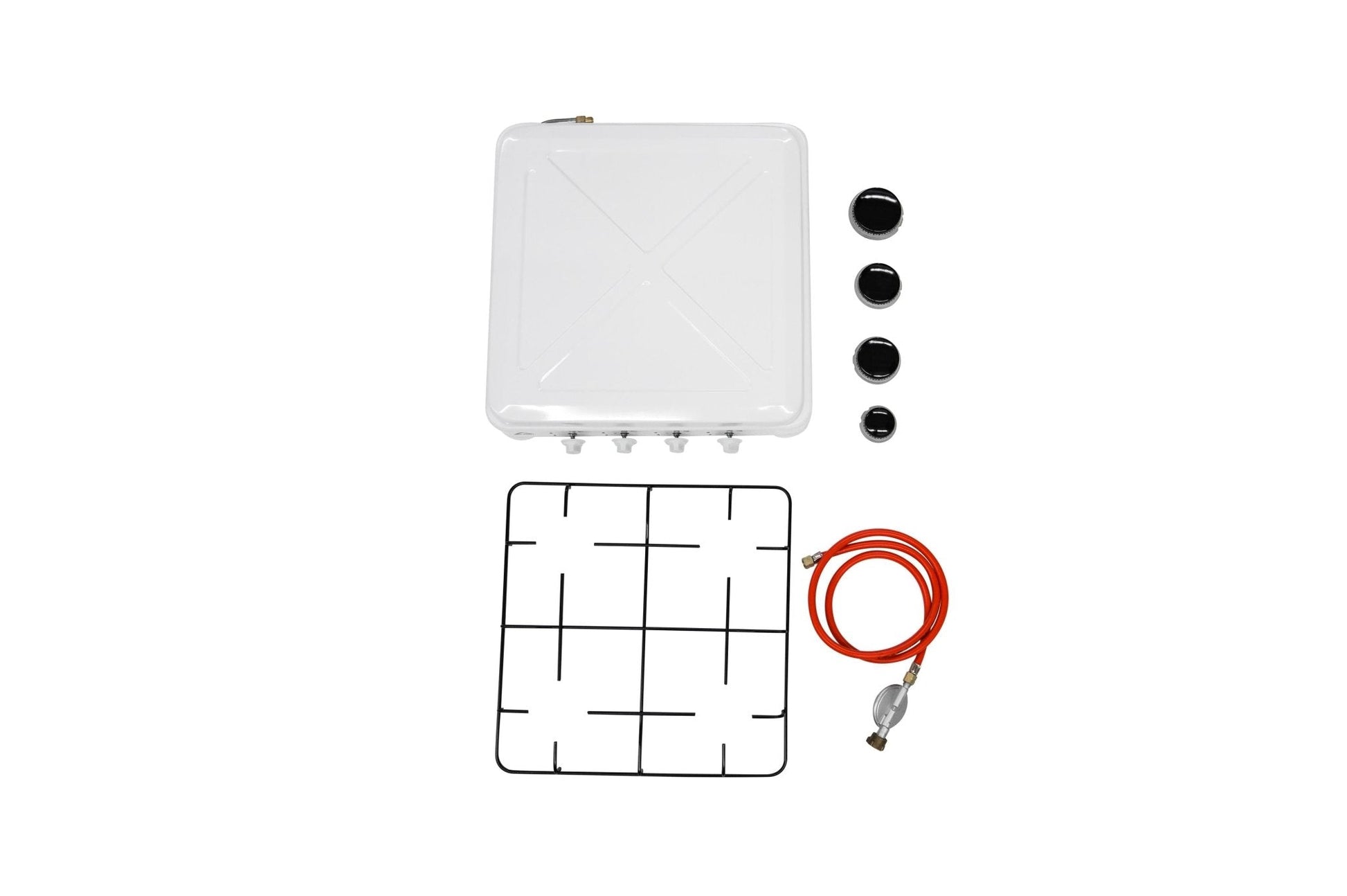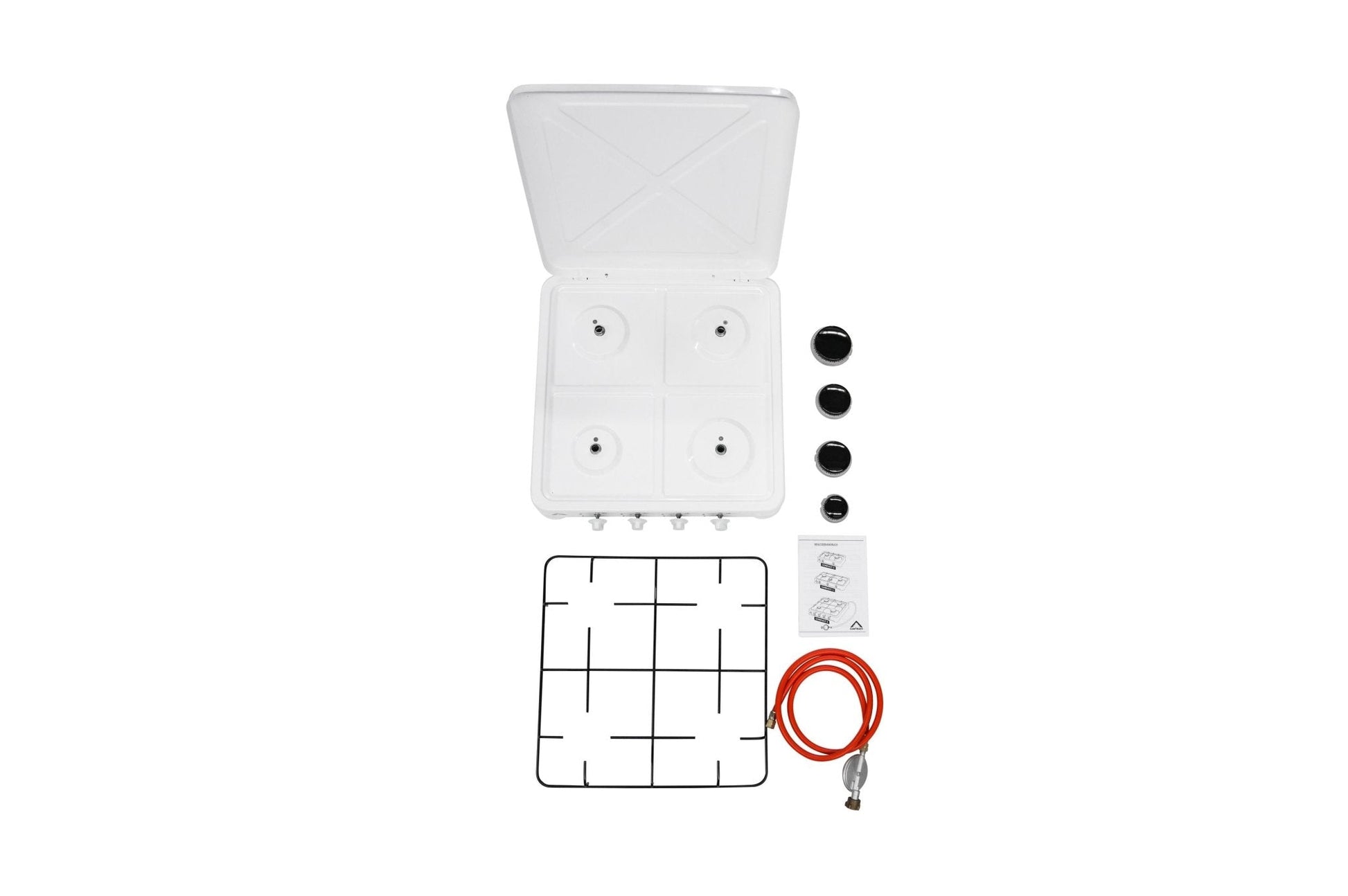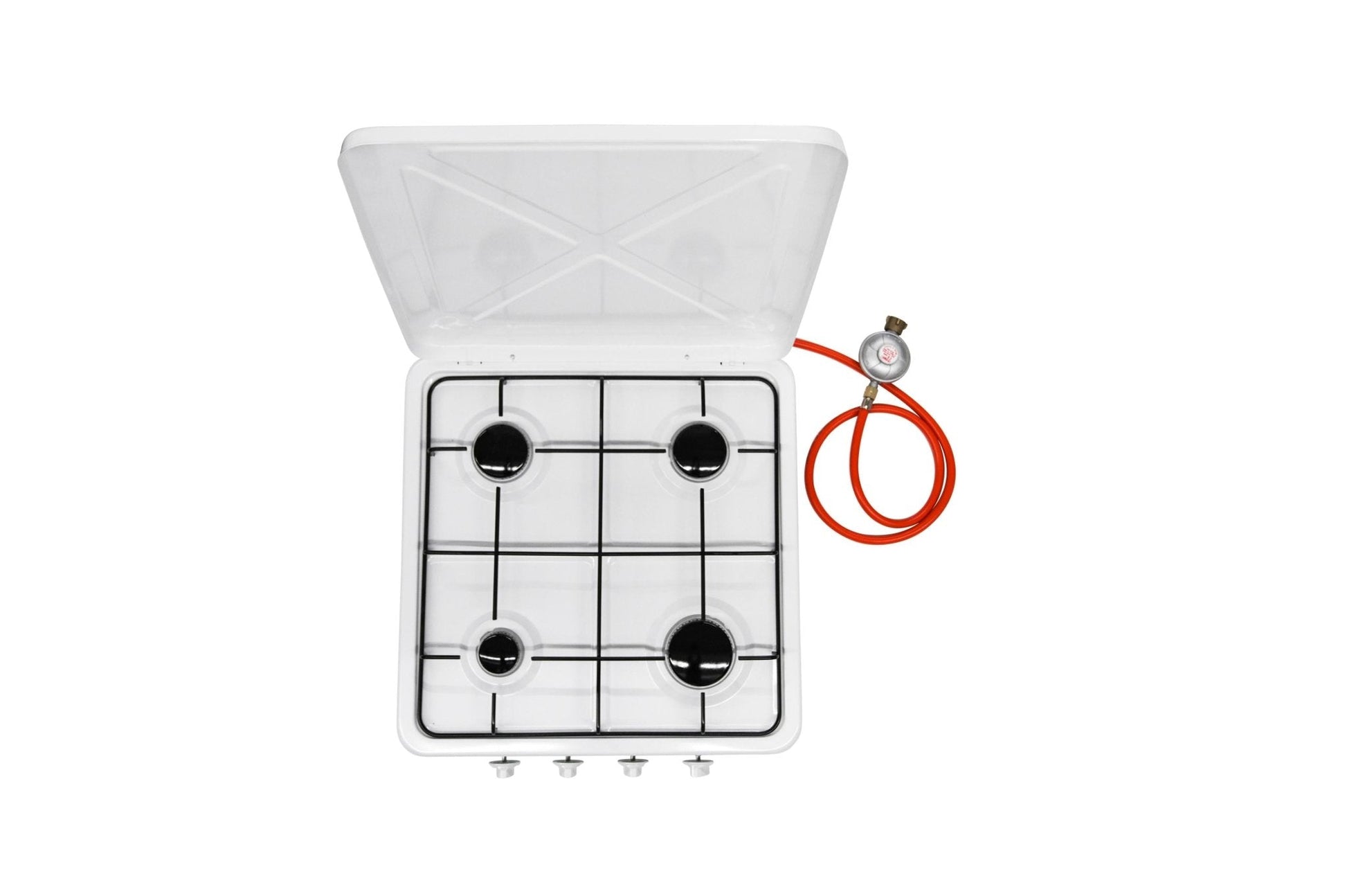 Kompakter Vierflammen Gaskocher aus pulverisiertem Aluminium Gehäuse. Stufenlos verstellbare Flammenregler. Der Topfrost kann entfernt werden für die Reinigung des Gaskochers. Der aufklappbare Deckel dient zugleich als Windschutz beim kochen, dadurch kann der Gasverbrauch deutlich reduziert werden. Der Gaskocher kommt mit 1 1/4 Zoll Anschluss inklusive Gasschlauch und 29 m/Bar Druckregler.