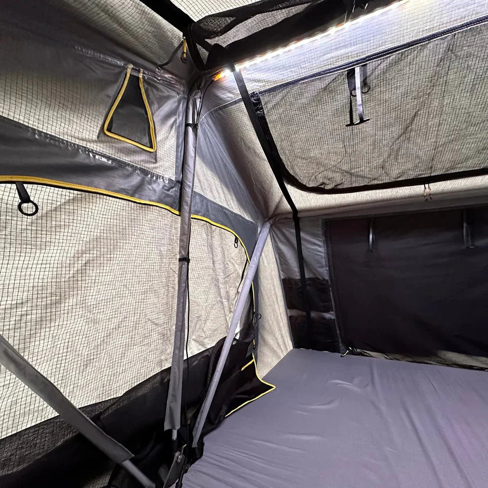 Ambiente im Dachzelt: Die LED-Leuchten sind im Innenraum des Dachzelts integriert und können bequem per dimmbarem Schalter bedient und zwischen drei unterschiedlichen Farbtönen hinundher geschaltet werden.