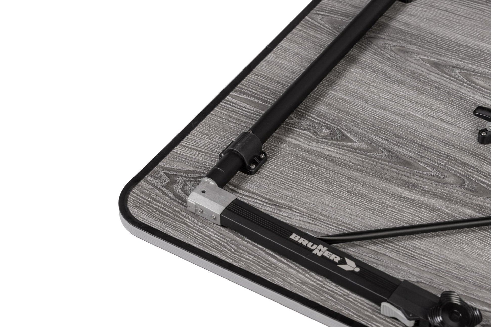 Der Premium Camping- und Outdoortisch kombiniert innovativen Klappmechanismus mit ultraleichter Wabentischplatte für maximale Funktionalität und Komfort. Die umlaufende Tischkante sorgt für zusätzliche Stabilität und Sicherheit. Dank der zentralen Gleitschiene ist der Tisch in Sekundenschnelle auf- und abgebaut. Die wetterfeste, hitzebeständige Tischplatte im Greywood-Design und das exklusive Klappgestell aus schwarz eloxiertem Aluminium mit präziser Höhenverstellung machen diesen Tisch zum idealen Begleiter für Outdoor-Abenteuer. Eine praktische Netzablage ergänzt das durchdachte Design.