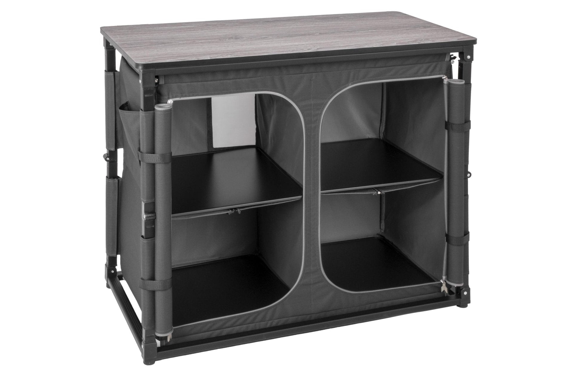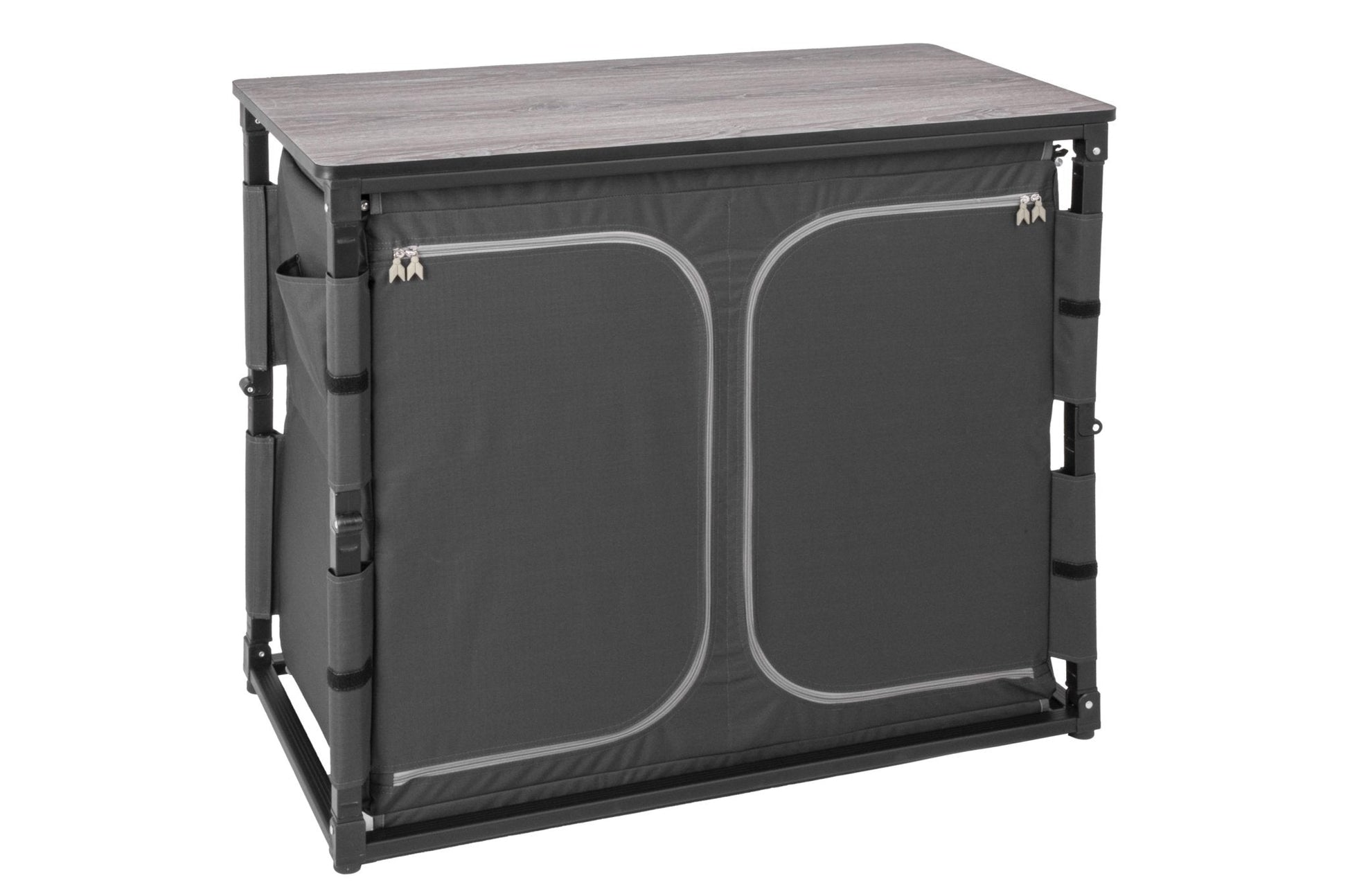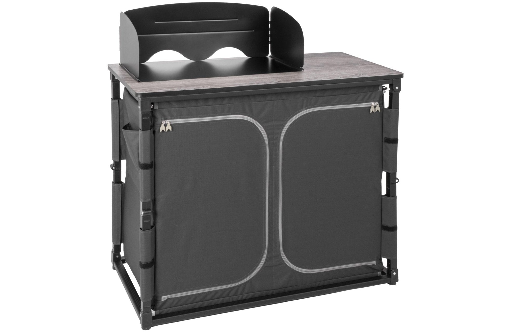 Die hochwertige Kochbox beeindruckt mit einem stabilen Klapprahmen aus Aluminium-Vierkantprofil und sekundenschnellem Auf- und Abbau dank spezieller Gelenkverbindungen. Sie bietet eine strapazierfähige, beidseitig beschichtete Gewebe-Oberfläche und eine ultraleichte Wabenarbeitsplatte im exklusiven Design. Langlebig, leicht zu reinigen und elegant, bleibt die Kochbox im geschlossenen Zustand kompakt für einfachen Transport und Aufbewahrung. Mit höhenverstellbaren Füßen, Utensilientaschen an den Seiten und einer praktischen Transporttasche ist sie der perfekte Begleiter für jede Outdoor-Küche.