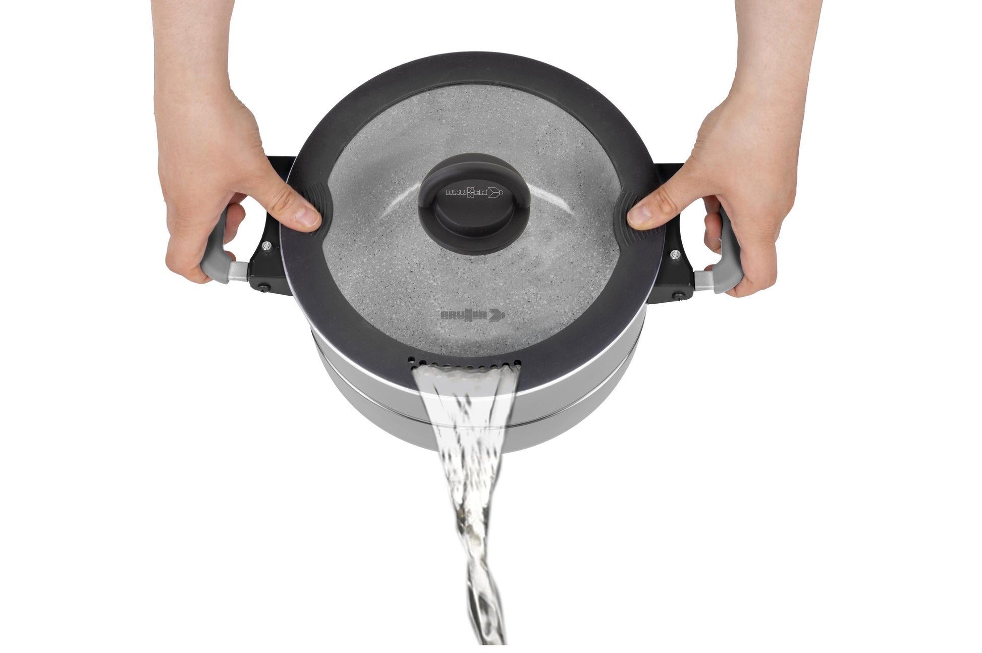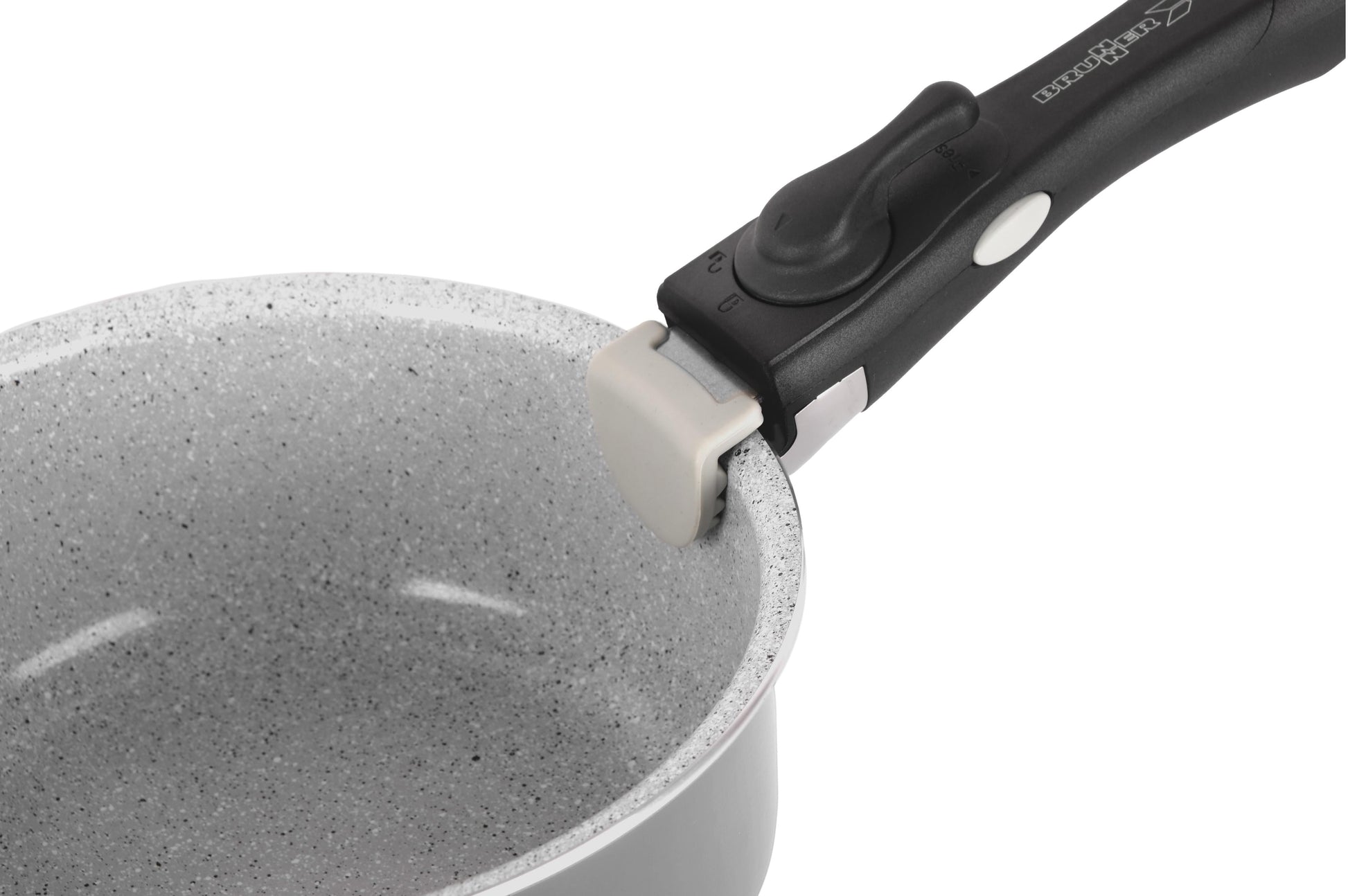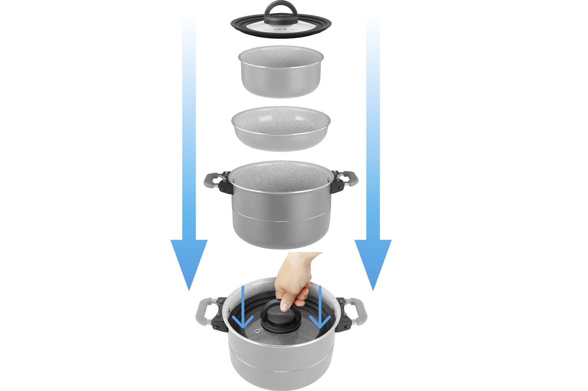 Neu entwickeltes Griff- und Verbindungssystem, das durch die Verwendung von abklappbaren Griffen mit integriertem Magnetelement eine deutliche Verringerung des Packmaßes der Topfsets ermöglicht und zudem die Verwendung eines Zurrgurtes zur Stabilisierung von Topf und Pfanne während des Transportes unnötig macht. Hochwertige Kochgeschirrsetkollektion mit induktionsfähigem Boden und kratzfester Keramik-Antihaftbeschichtung für fettarmes und schonendes Braten. Ausgestattet mit den revolutionären Vacublock und Magnetogrip Systemen. Alle Töpfe und Pfan- nen sind platzsparend ineinander stapelbar.