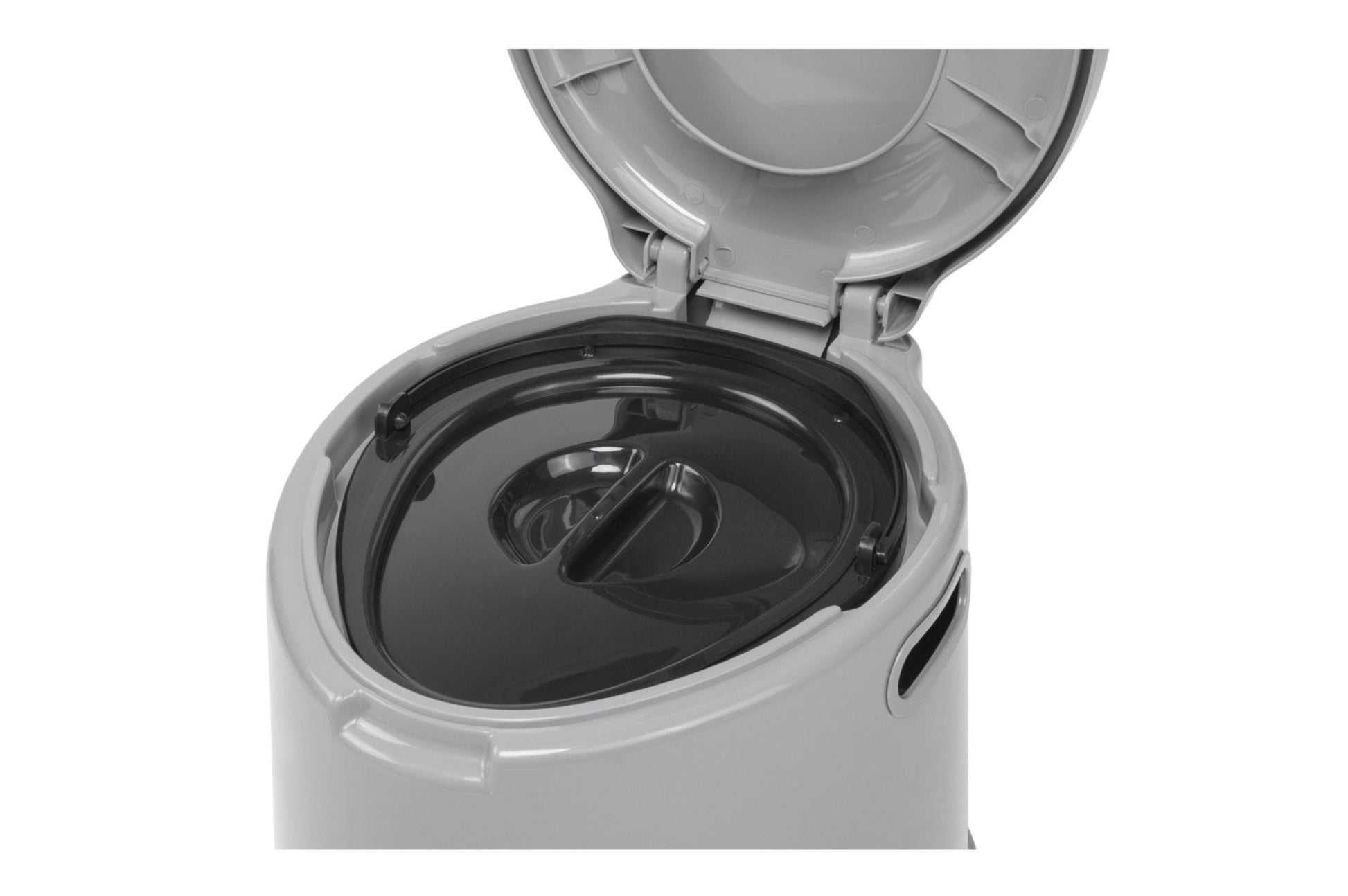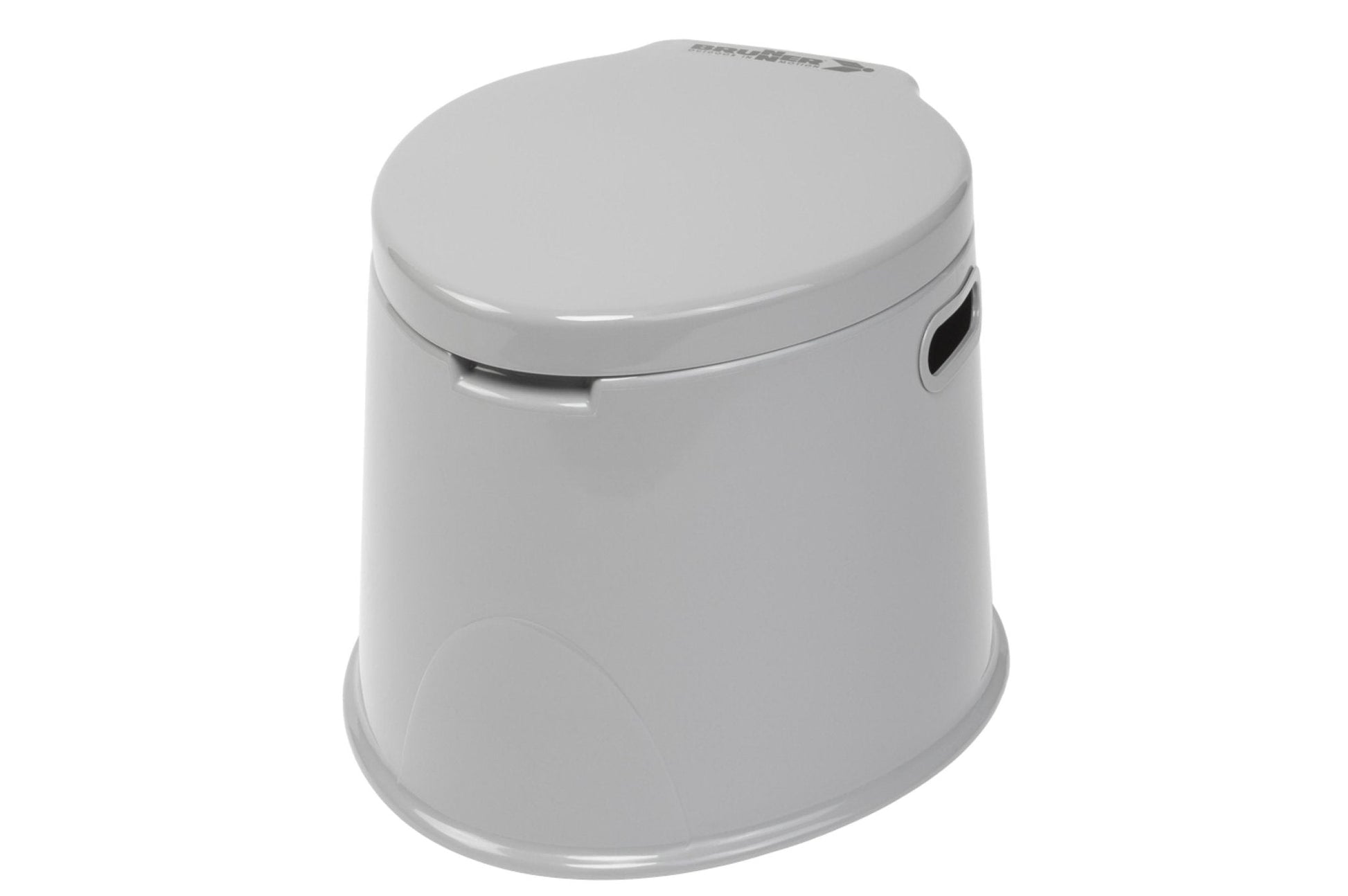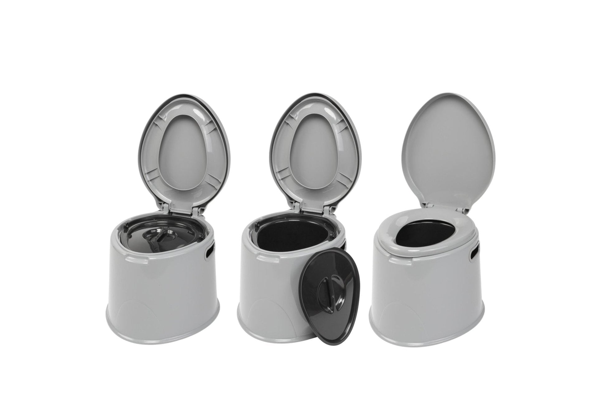 Moderne tragbare Chemie-Toilette mit Sitz, Deckel und separat verschließbarem Eimer.