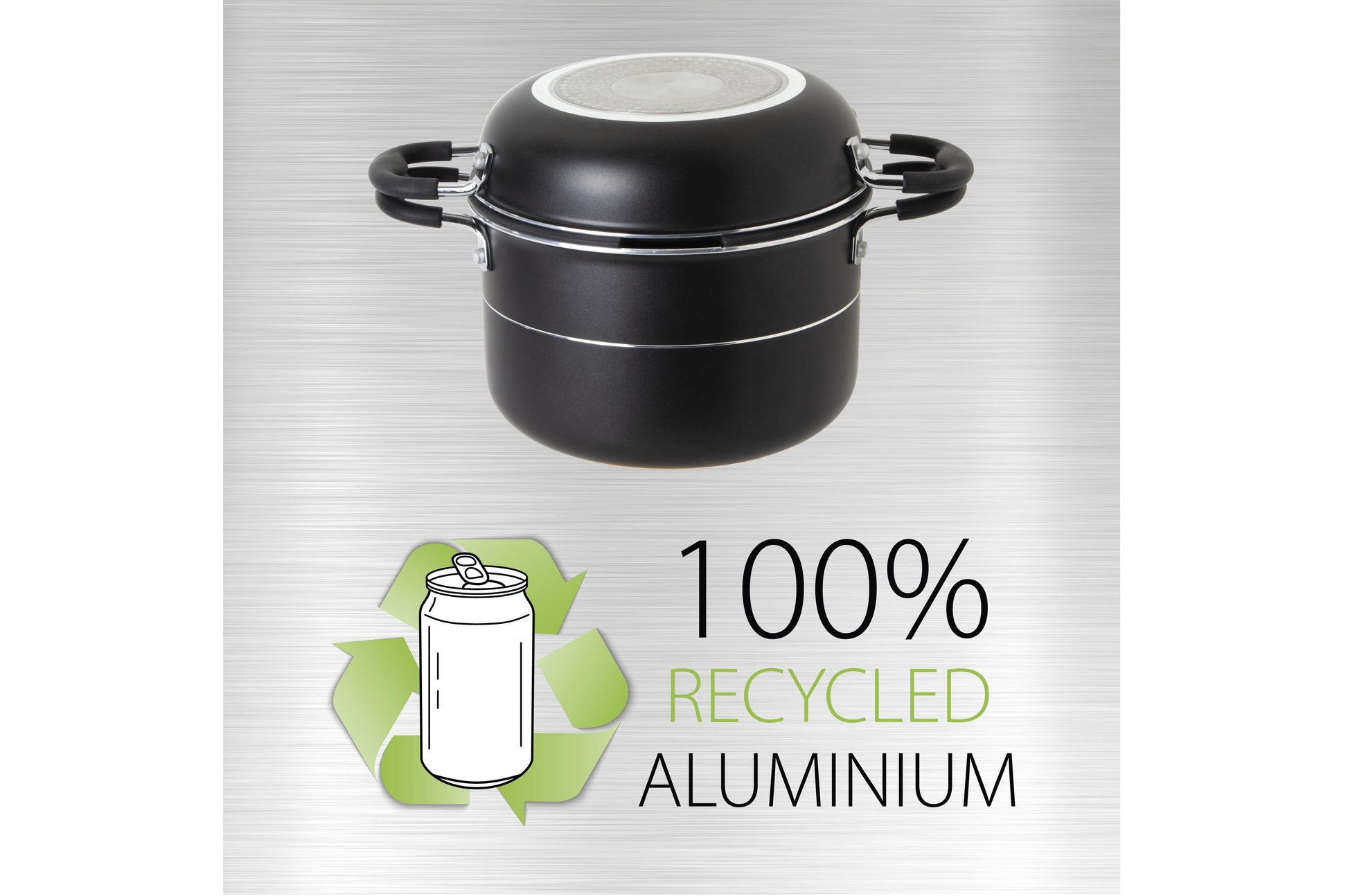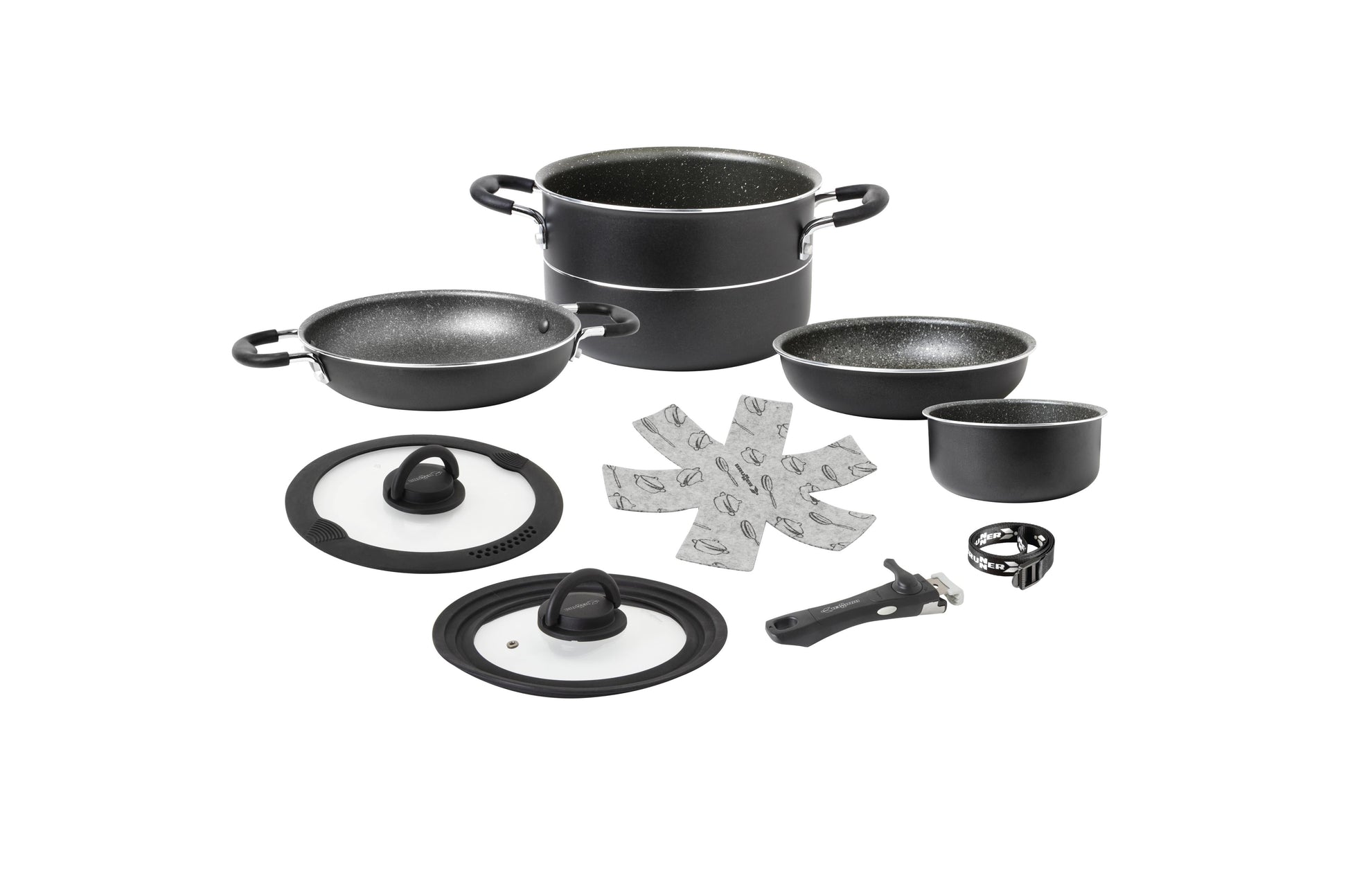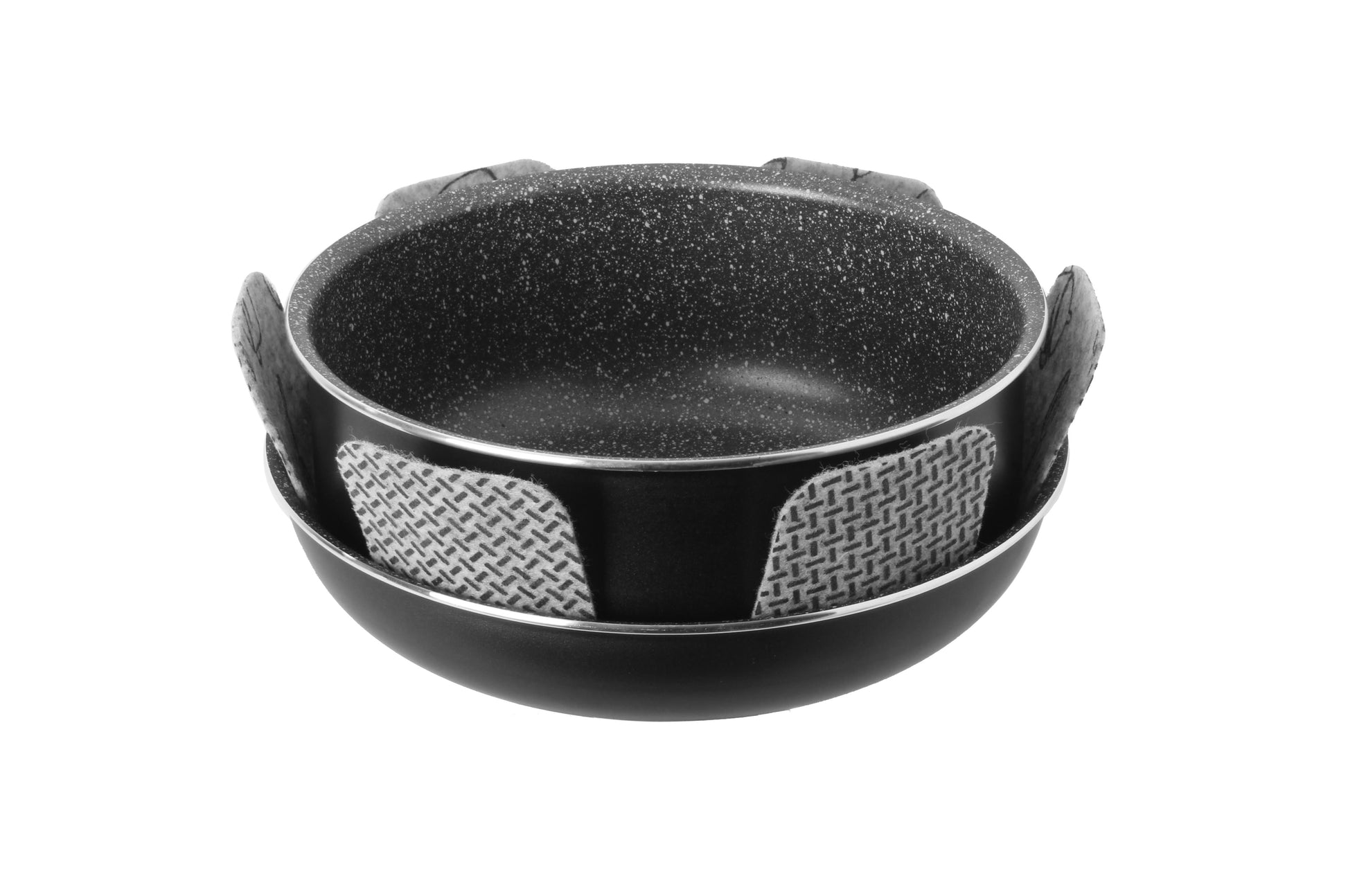 Inhalt 1 Topf ø 22 cm - 5,3 l, 1 Pfanne ø 22 cm - 2 l, 1 Pfanne ø 20 cm -1,7 l, 1 Topf ø 18 cm - 1 l, 1 Deckel ø 22 cm, 1 Deckel ø 22/20/18 cm, 1 Griffzange und 1 Gurt