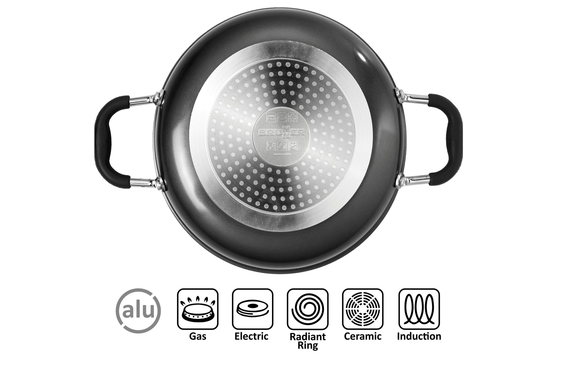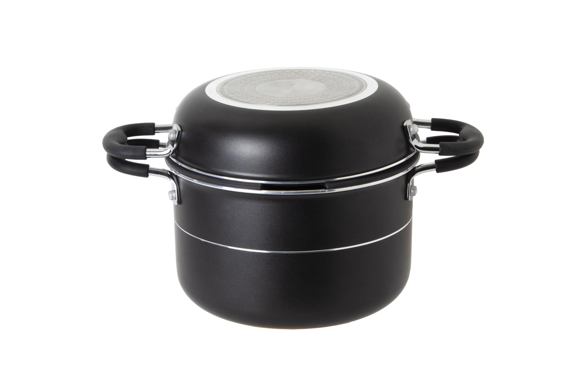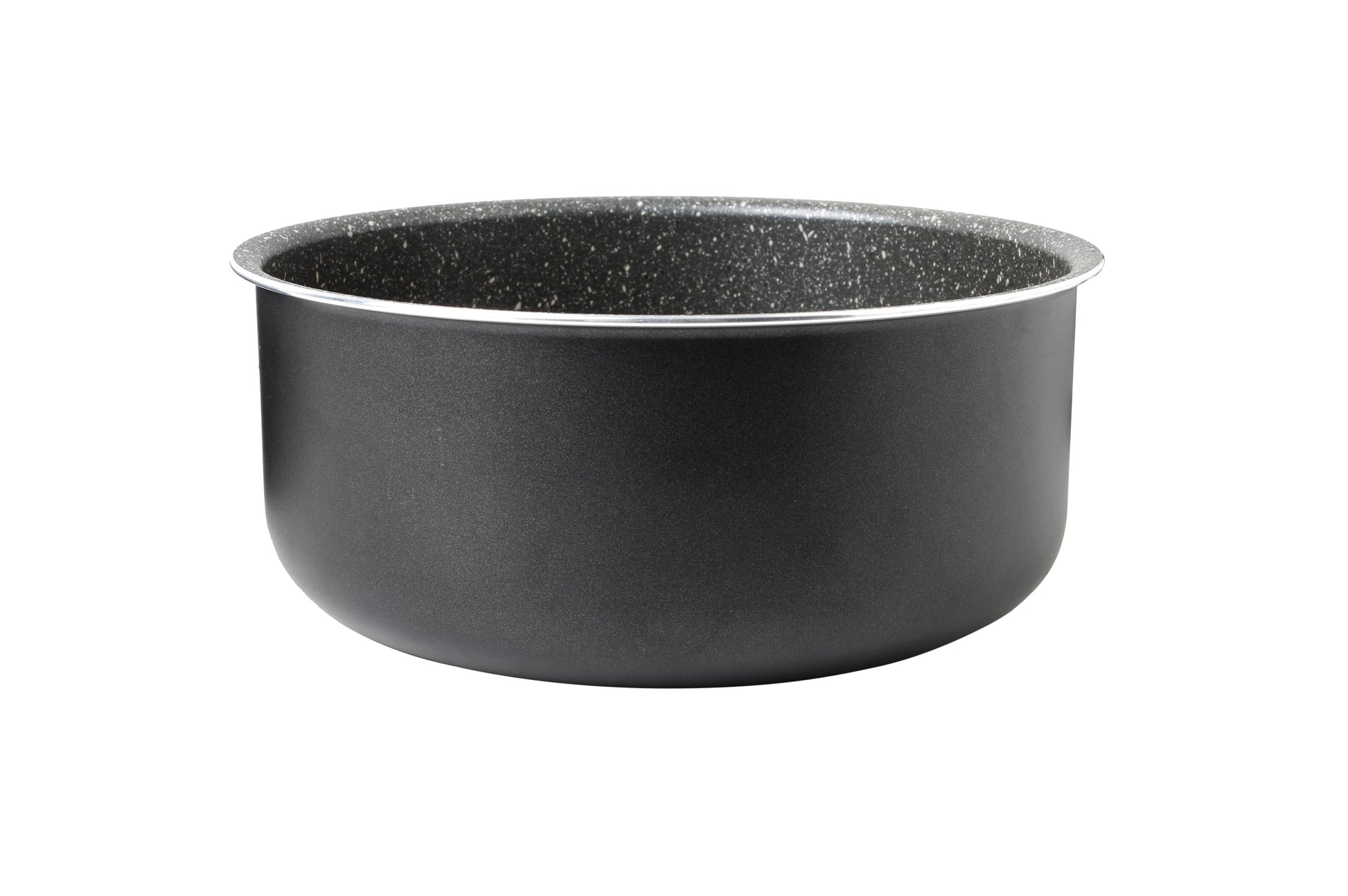 Inhalt 1 Topf ø 22 cm - 5,3 l, 1 Pfanne ø 22 cm - 2 l, 1 Pfanne ø 20 cm -1,7 l, 1 Topf ø 18 cm - 1 l, 1 Deckel ø 22 cm, 1 Deckel ø 22/20/18 cm, 1 Griffzange und 1 Gurt