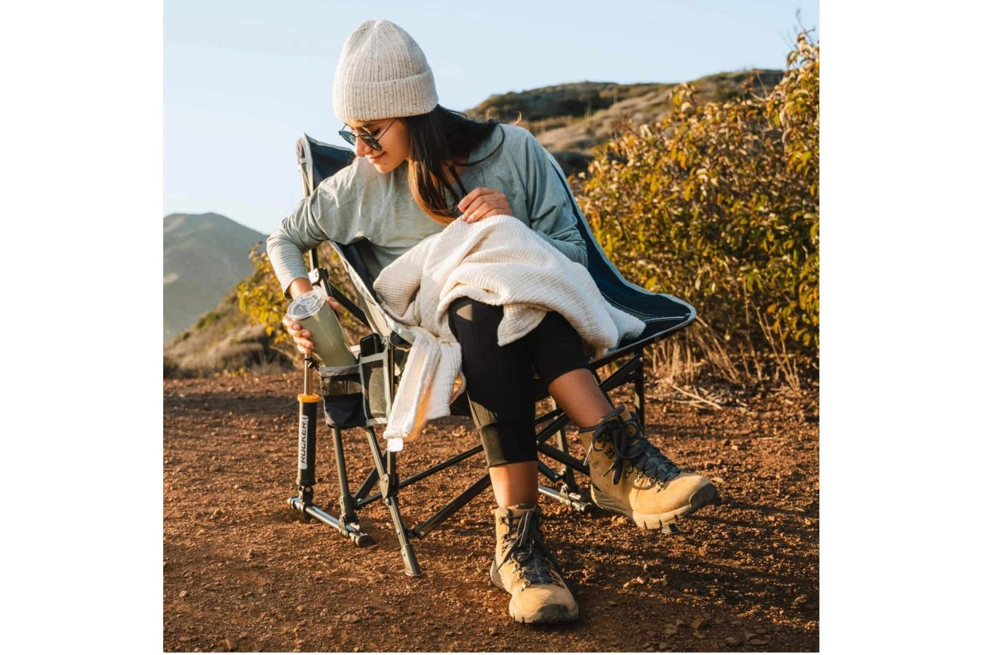 Der Pod Rocker ist nicht nur gemütlich, sondern auch praktisch. Er ist aus robustem, pulverbeschichtetem Stahl gefertigt und hält bis zu 113 kg aus. Er lässt sich leicht zusammenklappen und in einer stabilen Tasche mit Tragegriff transportieren.