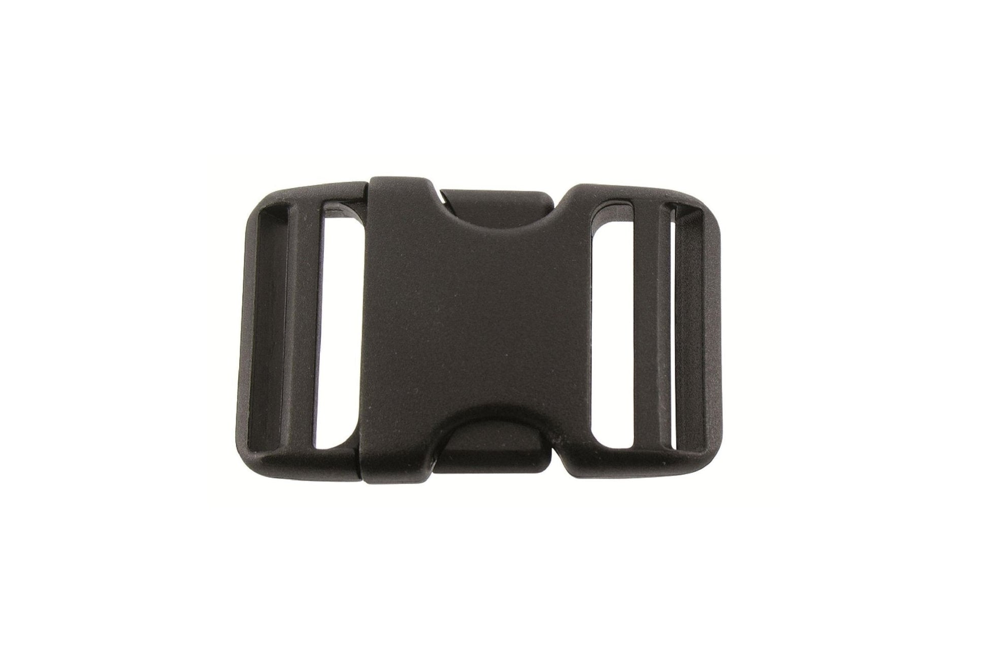 Ersatzschnalle mit Seitenauslösung. Eine 38-mm-Seitenverschlussschnalle mit "gebrochenem" Mittelsteg. Damit können Sie eine beschädigte Schnalle abschneiden und ersetzen, ohne sie nähen zu müssen.