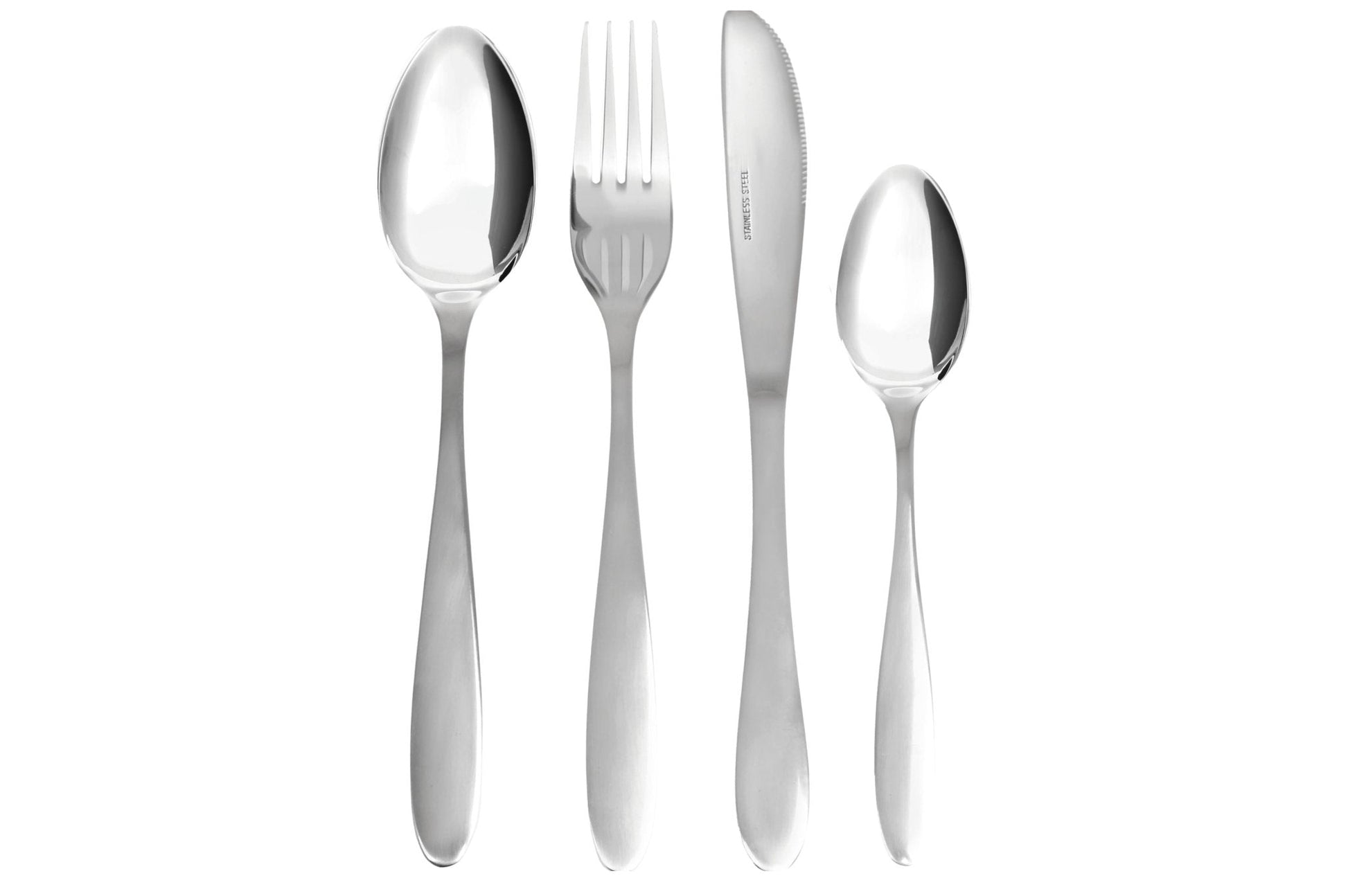 16-teiliges Besteckset. Bestehend aus je 4 Suppenlöffel, Gabel, Messer, Kaffeelöffel. Aus robustem Edelstahl gefertigt.