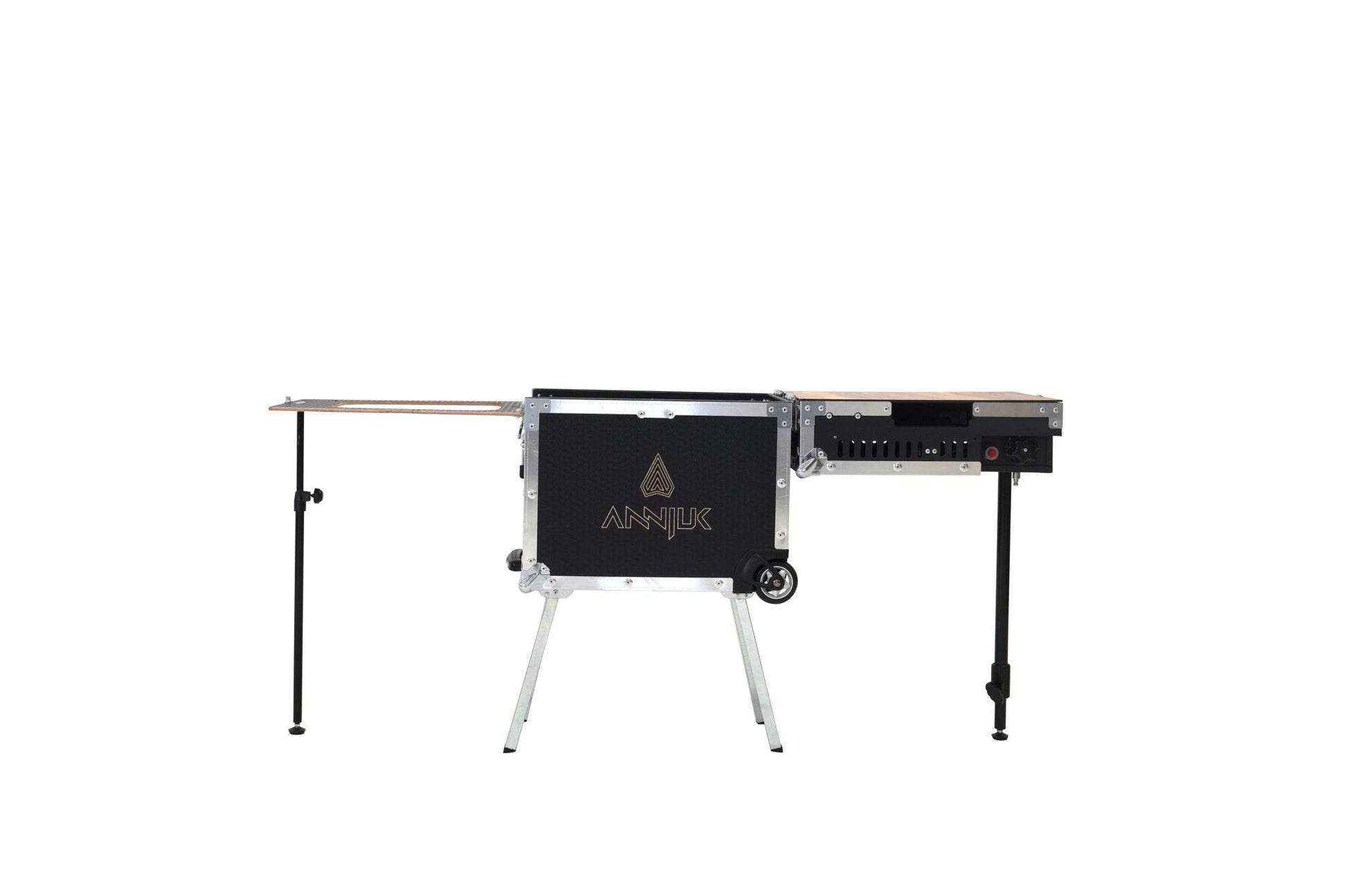 Die Kibo S ist eine faltbare Camping- und Outdoor Küche. Vier abklappbare Beine und zwei zusätzliche Beine zum anschrauben sorgen für einen sicheren Stand der Box. Sie verfügt über eine Gasplatte, eine Arbeitsfläche und einem Abwaschbecken aus Chromstahl inklusive einem Wasserhan. Der Wasserhahn kann mittels einem USB Kabel aufgeladen werden, der mitgelieferte Schlauch kann in einen Behälter mit Wasser gesteckt werden und schon haben Sie fliessend Wasser. Das Chromstahlbecken hat ein Abflussrohr welches wiederum in einen leeren Behälter geführt werden kann. Unter der Arbeitsplatte finden Sie genügend Stauraum für Ihre Küchenartikel. Die Kibo S ist mit Räder und einem verstellbaren Ziehgriff ausgestattet. Durch das sehr leichte Gewicht und dem kleinem Packmass kann die Box sehr gut im Auto verstaut werden. Der Gasanschluss ist mit einer Schnellkupplung vorbereitet. Die Gasleitung und der Druckregler (passend auf die gängigen Gasflaschen) kann bei Bedarf dazubestellt werden. Optional ist auch eine Grillplatte verfügbar. Die Gasflasche ist nicht im Lieferumfang enthalten.